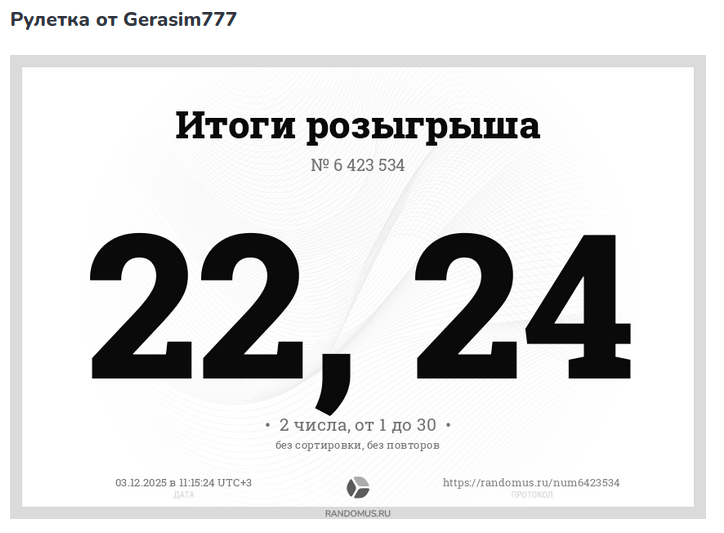 21.03.2024 – рулетка от пользователя Gerasim777 – на три призовых места